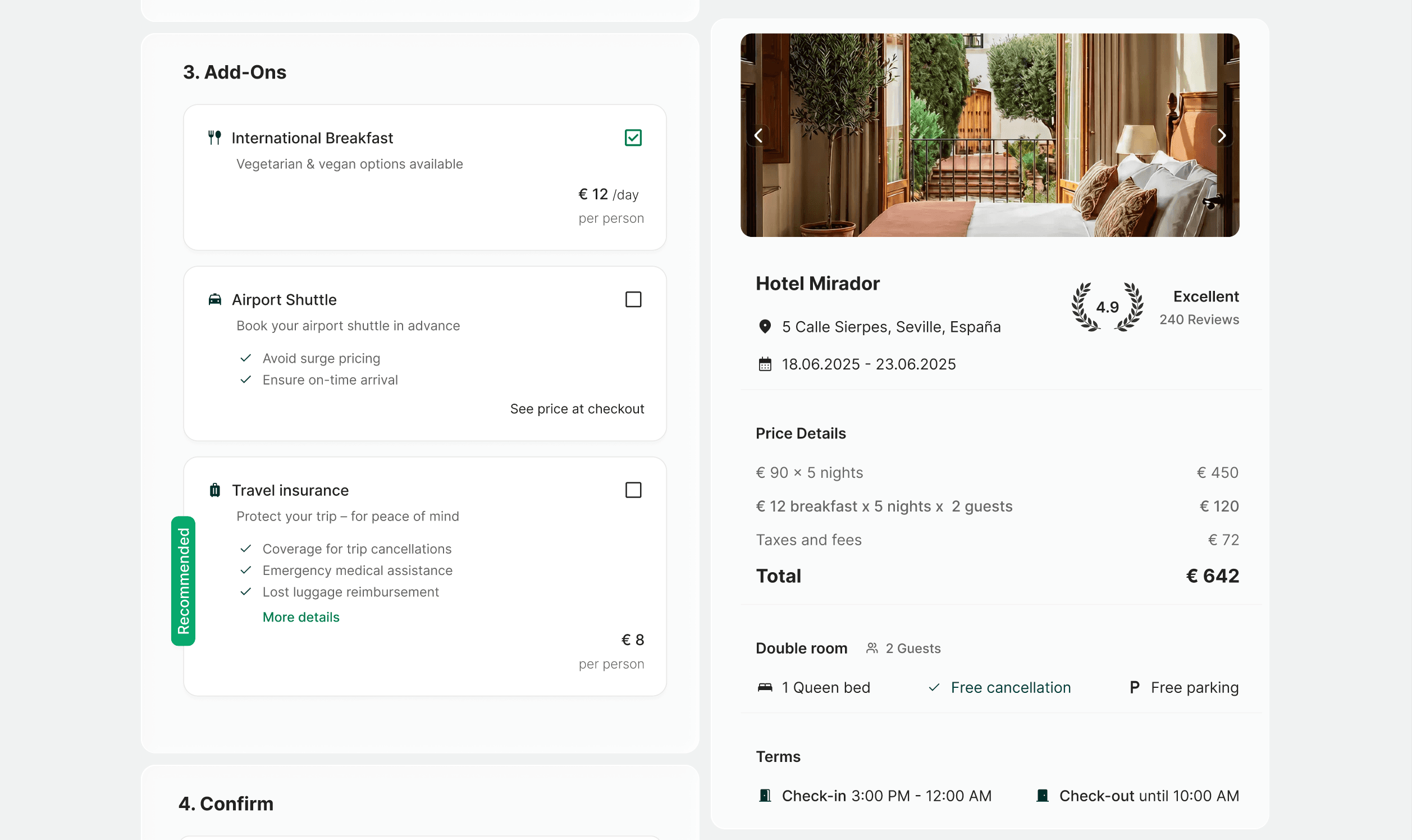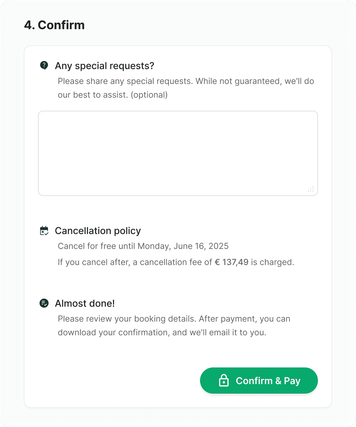Cancellation policy and check-in times visible before users commit — building trust & confidence early rather than creating doubt at the final step.