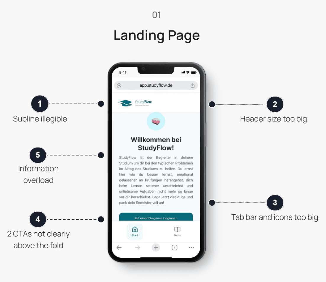 Some issues that users worked around in testing were still valid heuristic violations. Users skimming long copy or interpreting a prefilled field as a placeholder does not mean those patterns are acceptable. A workaround is not the same as good design. One assumption was genuinely revised: I had initially questioned whether the "Alle Tools" CTA added value right after a personalized diagnosis, but several users actively chose to browse it before exploring their recommendations. This changed how I thought about the tool discovery flow.